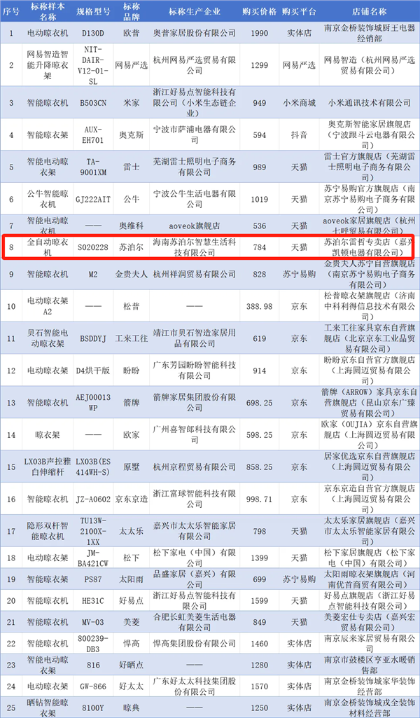 其中包含苏泊尔智能晾衣架,该产品在尺寸偏差项目、运行项目上均不符合相关标准。标称生产企业为海南苏泊尔智慧生活科技有限公司。