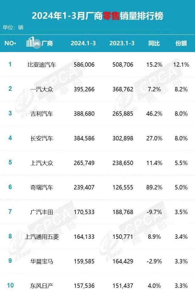 乘联会公布的今年前三个月零售销量数据显示,零售销量前十位的车企中,合资品牌仍然占据半壁江山,不过前五名中只剩下两个合资品牌,自主品牌正在成为高销量的代名词。