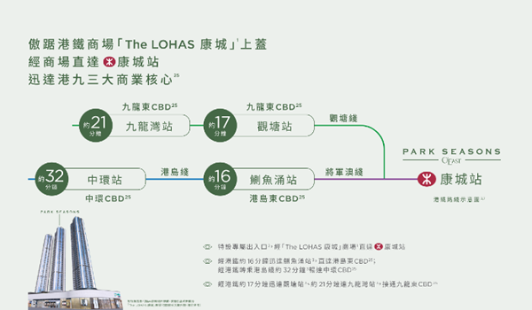 PARK SEASONS作为“O’East”系列的压轴之作,位于港铁商场“The LOHAS康城”上盖,交通便利,四通八达。无论是经商场直达港铁康城站,此外,将军澳跨湾大桥及将军澳蓝天隧道的开通,令项目的交通更升级,无论到香港岛东或九龙东的商业核心区,都十分迅速。而这座全港首条集行车、行人、单车和观景于一体的跨湾大桥,不仅为居民的出行提供了极大的便利,更为他们带来了特别的海景体验,在假期更成为休闲娱乐热点地。