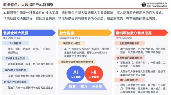 其中,其大数据用户心智洞察基于海外博客、论坛、社媒和电商等七大数据源,借助行业调研、专家访谈和大模型等方式,进行维度模型训练,从而生成包含市场研究、行业研究、竞品研究、用户洞察等在内的全景数据,帮助出海企业以数据了解海外市场和消费者。