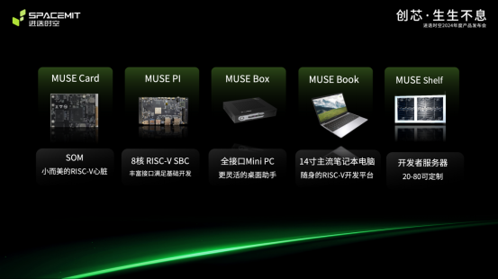 据悉,进迭时空在这场年度产品发布会上不仅发布了自研SpacemiT Power Stone™ P1电源芯片、SpacemiT Key Stone™ K1终端芯片,还发布了搭载K1芯片的SpacemiT Muse™ Book、SpacemiT Muse™ Shelf和SpacemiT Muse™ Box等生态产品。陈志坚在发布会上透露,SpacemiT Muse™ 系列生态产品将于近期开启预售,为全球RISC-V生态建设提供更加便捷的软硬件产品支持。