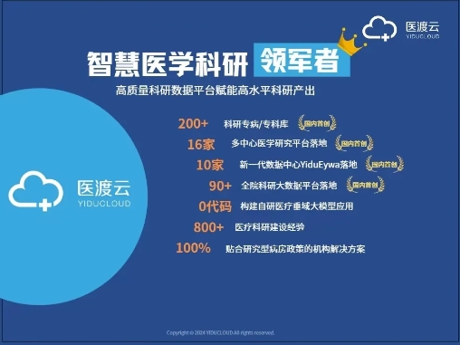 截至目前,已与眼科国家临床研究中心等16家机构合作建设多中心科研平台,与90+医院合作建设全院科研平台,与200+PI团队合作建设科研专病库项目。医渡科技希望大数据与人工智能技术可以持续赋能临床研究的高效开展,推动疾病研究及诊疗水平的提升。