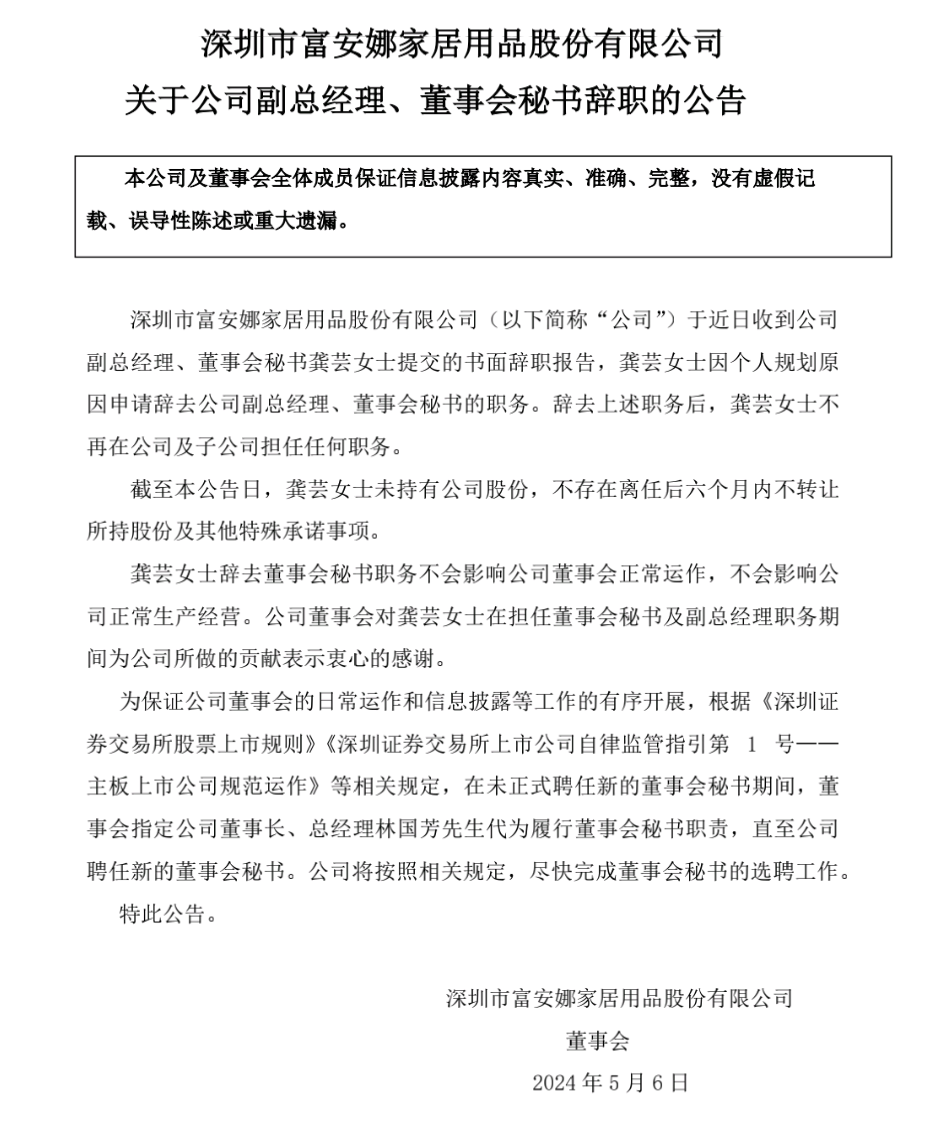 5月6日,富安娜发布公告称,近日收到公司副总经理、董事会秘书龚芸提交的书面辞职报告,其因个人规划原因申请辞去公司副总经理、董事会秘书的职务。辞去上述职务后,龚芸不再在富安娜及子公司担任任何职务。