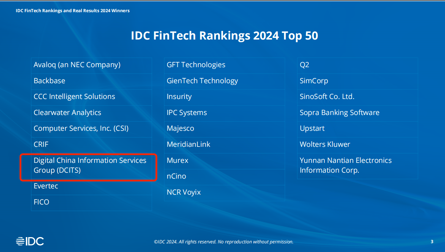 作为全球著名的信息技术研究与咨询公司,IDC 已连续21年进行“IDC 全球金融科技排行榜”评选,榜单评选依据为2023年度厂商服务于金融机构硬件、软件及服务的营收,其权威性和公正性在行业内广受认可。