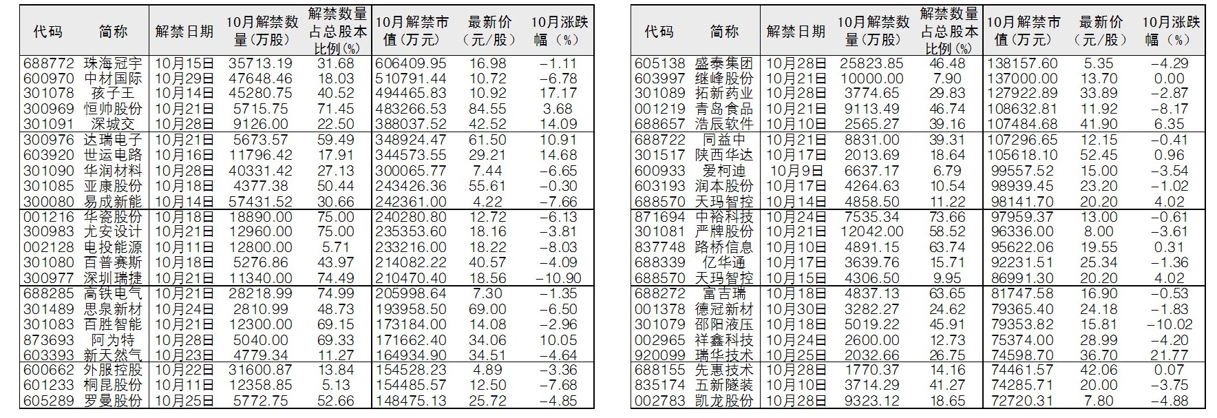 根据Wind数据统计,10月A股限售股上市数量为72.11亿股,以10月9日收盘价计算,市值约为1175.59亿元。其中,46股解禁市值超过7亿元,珠海冠宇、中材国际解禁市值超过50亿元。