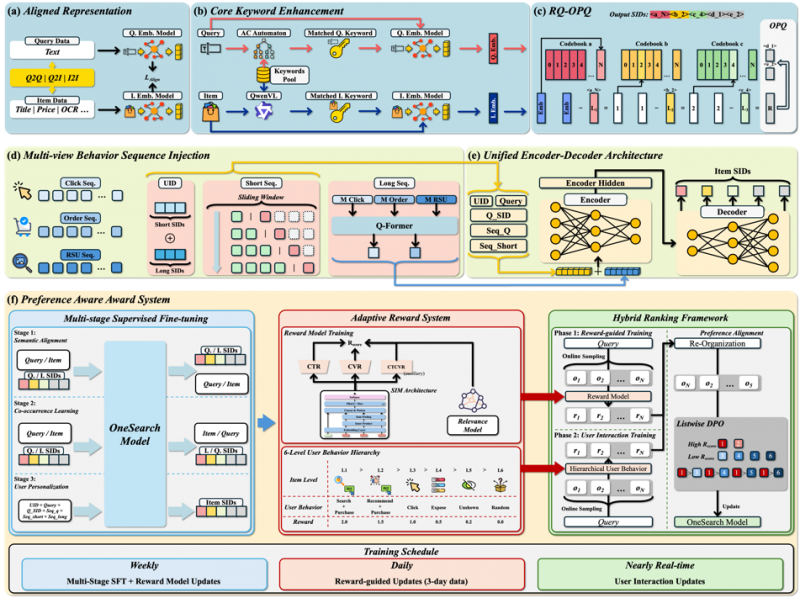 OneSearch框架集三大创新于一身:关键词增强层次量化编码(KHQE)模块、多视角用户行为序列注入策略以及偏好感知奖励系统(PARS)。