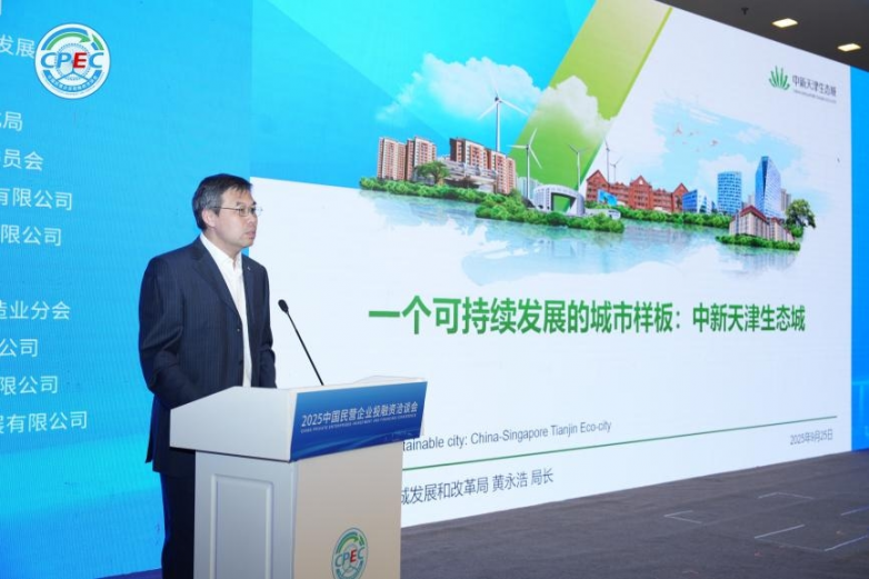 中新天津生态城发展和改革局局长黄永浩现场推介生态城建设成果,阐释其作为国家绿色发展示范区在高端制造领域的产业优势与发展机遇。