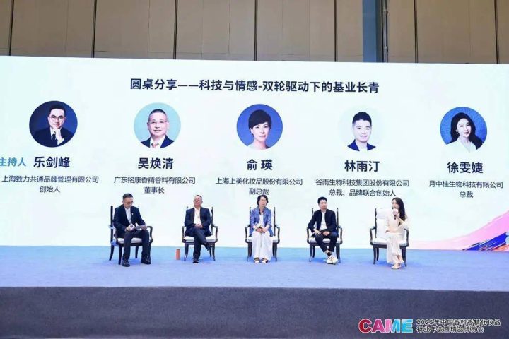 论坛的压轴环节是一场思想激荡的圆桌讨论,主题为“科技与情感-双轮驱动下的基业长青”。在主持人的引导下,广东铭康香精香料有限公司董事长兼总经理吴焕清、上海上美化妆品股份有限公司副总裁俞瑛、谷雨生物科技集团股份有限公司总裁兼品牌联合创始人林雨汀、月中桂生物科技有限公司总裁徐雯婕四位嘉宾,就如何平衡与融合科技硬实力与情感软连接展开了深度对话。
