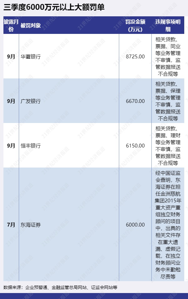 三季度金融机构有4张6000万元以上大额罚单,其中华夏银行领罚没金额最大的罚单,因相关贷款、票据、同业等业务管理不审慎,监管数据报送不合规等被罚没8725万元。相关责任人钱建华、何羽、吕玉梅、涂超被处以警告并罚款合计20万元,陈成天、刘建新被处以警告。
