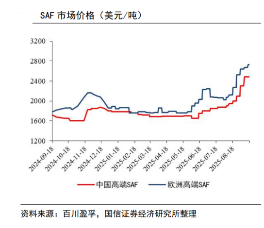 因强制添加政策执行力度、原材料成本及长期需求提升等方面因素影响,近期SAF价格持续上涨。近期国信证券研报也认为,由于SAF强制添加目标未改,SAF原料(UCO)较为稀缺,SAF的高景气有望持续。