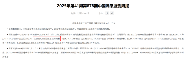 根据中国疾病预防控制中心发布的流感监测周报,在第41周(10月6日至10月12日)采集的流感阳性样本中,甲型H3N2已成为当前优势流行毒株。
