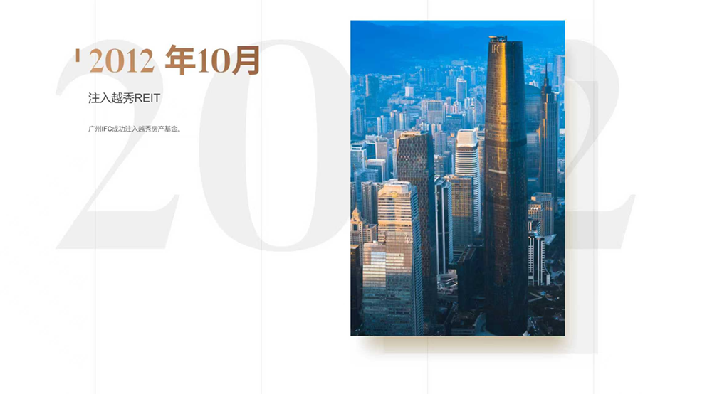 这座城市地标在2012年迎来了重要发展——正式完成注入越秀房产基金,这一被行业人士称为“巨人项目”的交易,推动了越秀房产基金实现里程碑式的重大跨越,不仅使基金资产规模大幅增长,成为亚洲市值前列的上市REITs之一,也推动了越秀“开发+运营+金融”模式的成型。
