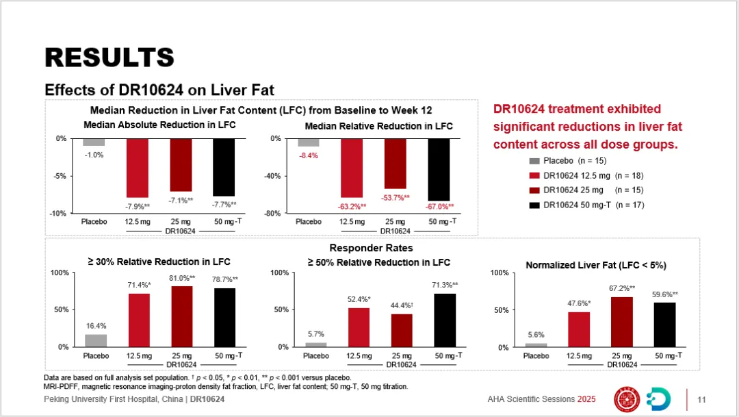 在接受治疗12周后,相较安慰剂组,DR10624的各剂量组的肝脏脂肪含量(LFC)都显著降低,中位百分比降幅最高达67%。不仅如此,DR10624治疗后实现LFC相对基线降低幅度≥30%、≥50% 以及达到肝脏脂肪完全正常化(LFC<5%)>