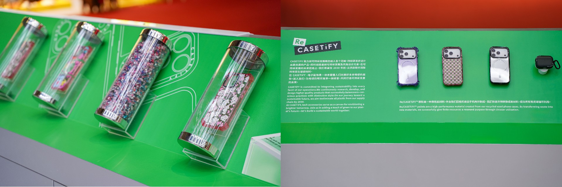 在可持续发展方面,Re/CASETiFY 展区清晰呈现了从回收到再生的良性循环过程。作为品牌可持续承诺的重要实践,CASETiFY 自 2021 年起便开展了「Re/CASETiFY 重塑新生」手机壳回收计划,将旧手机壳回收再利用,成为全新产品的部分材料以及全球艺术家共创的灵感源头,以实际行动减少环境负担,向市场传递了积极的可持续发展信号。