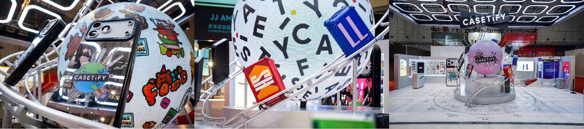 CASETiFY 的进博会展台本身就是一个精心设计的灵感空间,巧妙融合视觉冲击与互动体验,将品牌“韧性无界,灵感随行”的主题具象化。中心区域的独特球形屏装置,构成了展台的视觉焦点,周围环绕的展示轨道,勾勒出品牌从核心产品手机保护壳,延伸至全新 CASETiFY TRAVEL 弹韧防摔旅行箱的发展路径,标志着业务版图与产品生态的拓展。地面融入全球门店所在城市的地贴,呈现 CASETiFY 深耕本土,布局世界的坚实足迹。