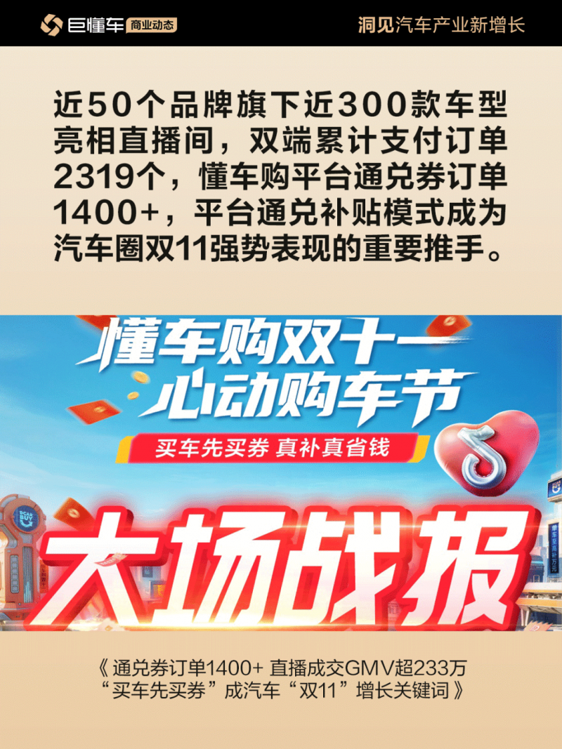(原标题:通兑券订单1400+ 直播成交GMV超233万 “买车先买券”成汽车“双11”增长关键词)