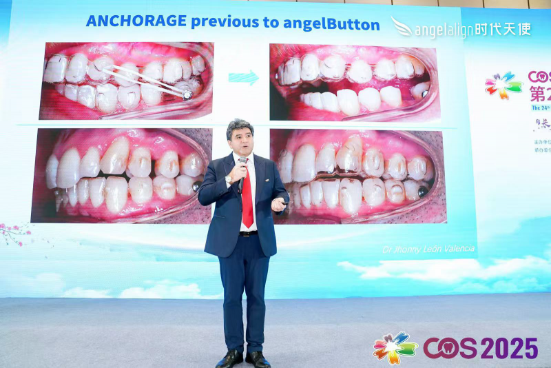 穆尔西亚大学教授、马德里康普顿斯大学牙科学博士Dr. Jhonny Leon Valencia在《支抗科学:力学效能、精准控制与生物力学方案》主题演讲中分享了隐形矫治的最新研究。他指出,隐形矫治的关键难点在于牙根控制,而天使扣集成设计有效解决了固位不足与牙根表达率低的问题。通过科学的支抗规划与精准力学控制,可实现高效磨牙远移与控根移动。他强调,通过合理的支抗设计与精准的力学控制,隐形矫治同样能够实现与固定矫治媲美的力学效能,确保精准施力与高效、稳定的矫治效果。