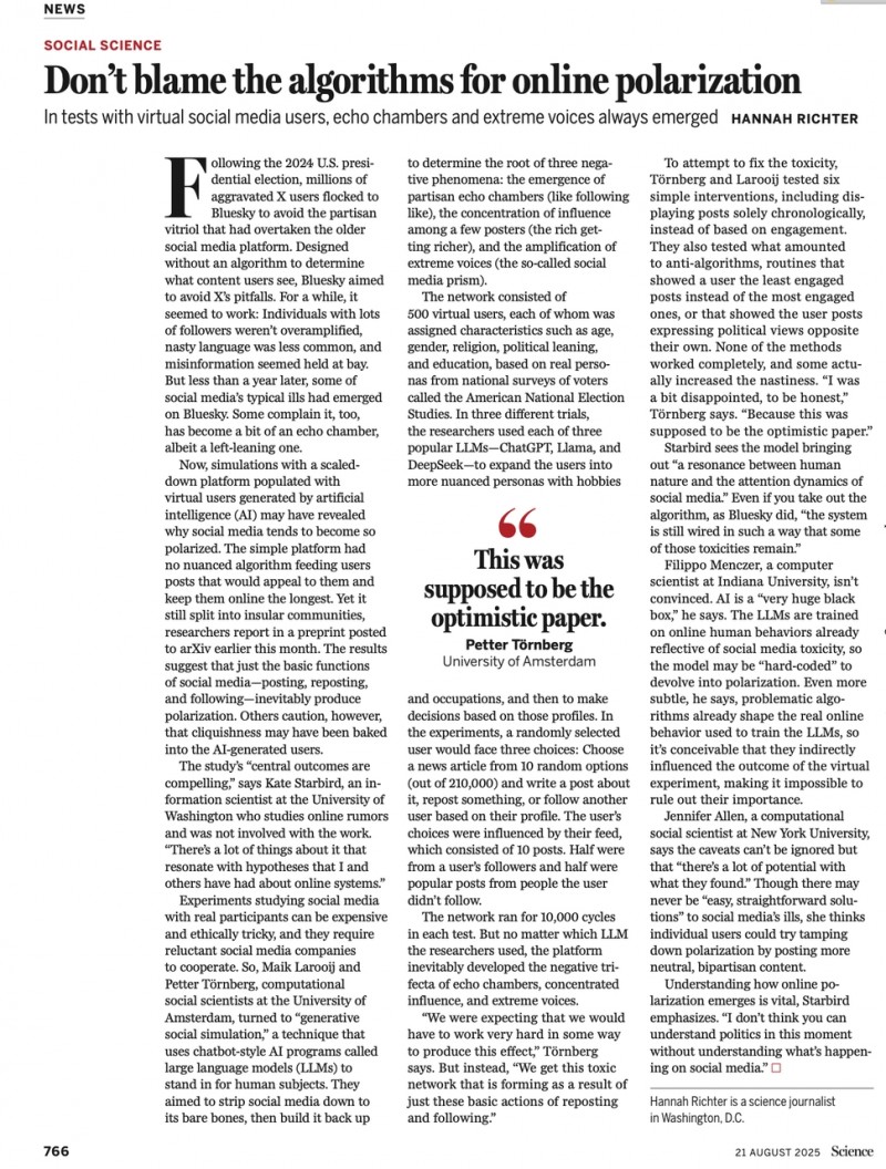 人类社交的固有倾向,在无算法干预的环境中同样会催生极化。阿姆斯特丹大学的研究团队搭建了一个仅保留发帖、转发、关注功能的极简平台,用500个带有真实人口学特征的AI智能体模拟社交行为。实验结果显示,无需任何个性化推荐,智能体很快按立场抱团,互相关注的多为观点相近者,中间派被边缘化;少数账号凭借高转发量成为“大V”,影响力高度集中;极端内容因更易引发情绪共鸣,传播速度和范围远超温和内容。这一过程复刻了现实社交媒体的极化图景,印证了问题的根源在于人类“趋同避异”的社交偏好和“情绪化优先”的传播规律。该项研究论文已经在Science杂志刊载。