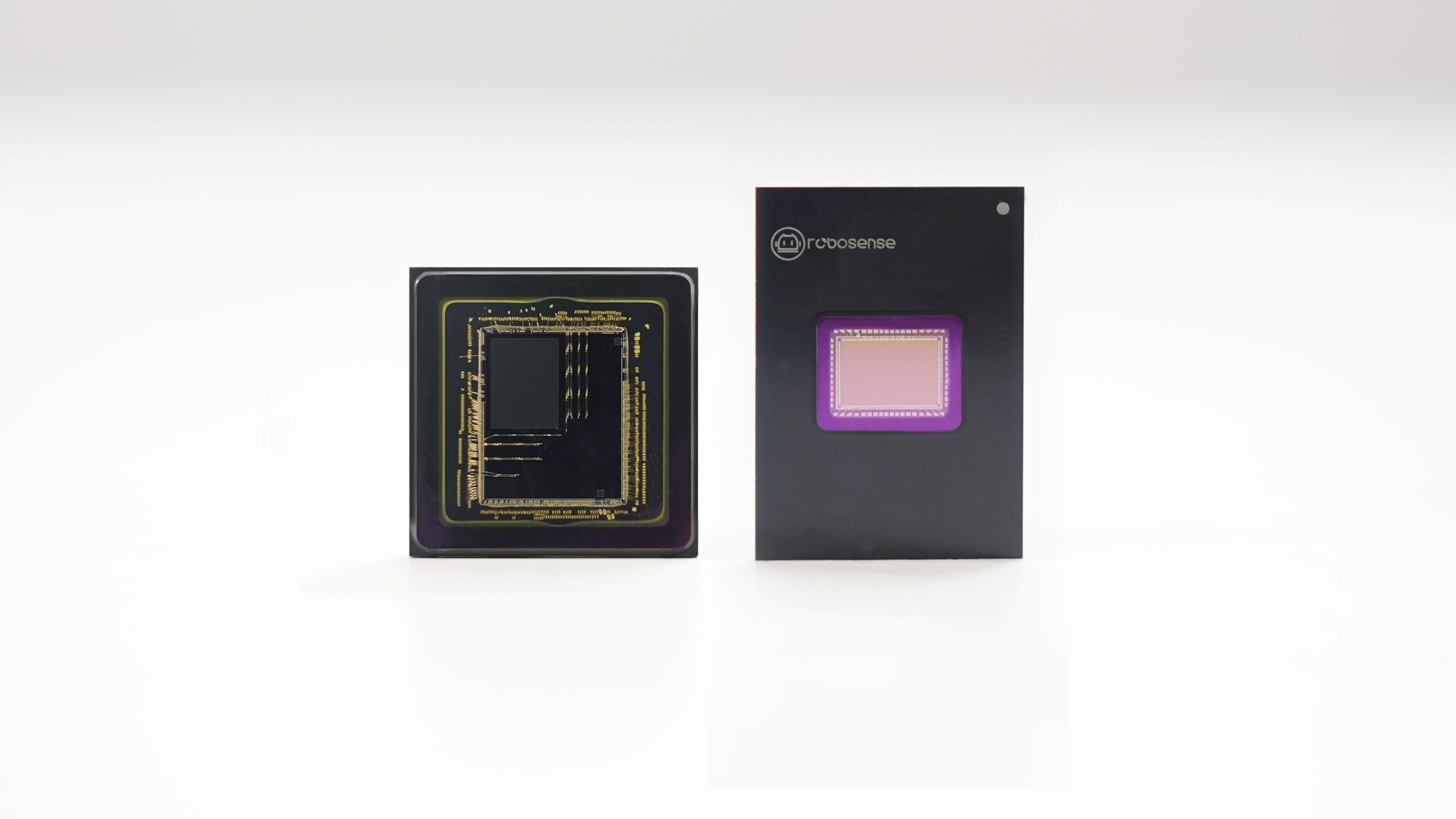 速腾聚创自研数字SPAD-SoC芯片(左)、二维可寻址2D-VCSEL芯片(右)均为全球唯一通过AEC-Q系列车规认证的数字化激光雷达芯片