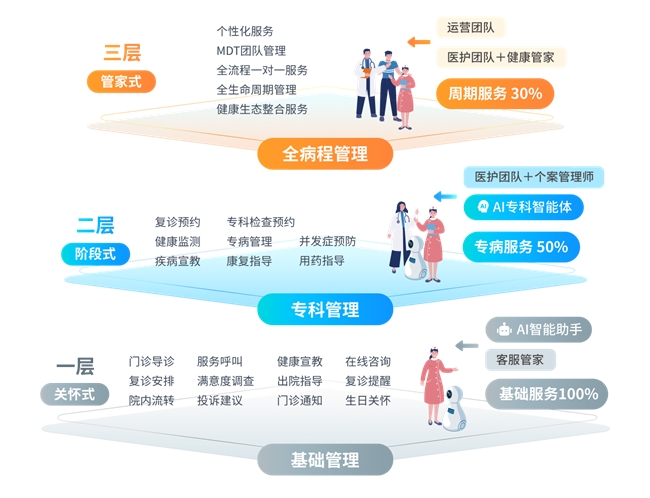 从患者全生命周期管理角度来看,AI+全病程管理模式通过融合电子病历、可穿戴设备、基因检测等多源数据,构建用户个性化的健康画像,不仅能够主动预测健康风险,还可基于用户特征生成涵盖营养膳食、运动健康、心理疏导等多维度的健康管理方案。通过为每位患者配备专属AI健康管家,实现出院后持续性的智能健康监护与动态方案优化。