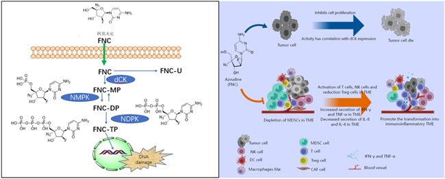 独特的双重机制成为支持其临床疗效的重要科学依据。2025年11月发表于《Frontiers of Medicine》的研究再次对此进行了印证:一方面,其作为核苷类似物的抗肿瘤活性与肿瘤细胞内脱氧胞苷激酶(dCK)表达水平密切相关;另一方面,其可通过抑制肿瘤微环境中免疫抑制细胞,尤其是髓源性抑制细胞(MDSCs)的分化/聚集,促进CD8+T细胞与NK细胞的浸润和扩增,并与免疫因子调节相关。