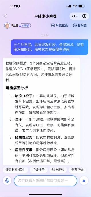 在对话框里,李女士详细描述:“3个月男宝,后背和胸口突发红疹,体温36.9℃,没有腹泻和呕吐、精神状态良好偶有哭闹”指尖刚离开屏幕,不到10秒就收到了回复,把可能是什么病、要重点观察什么情况、后续的建议、在家怎么护理、什么情况要去医院、挂什么科都安排得明明白白!