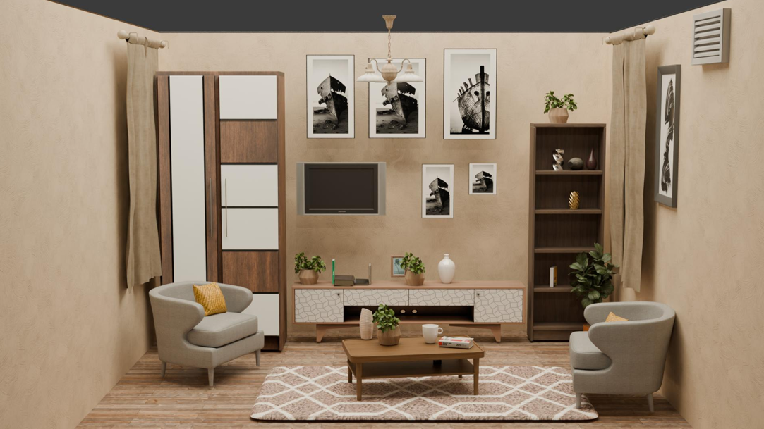 输入提示词"一间温馨的客厅,配有舒适的扶手椅、画廊墙和时尚的咖啡桌"后生成的效果图示意