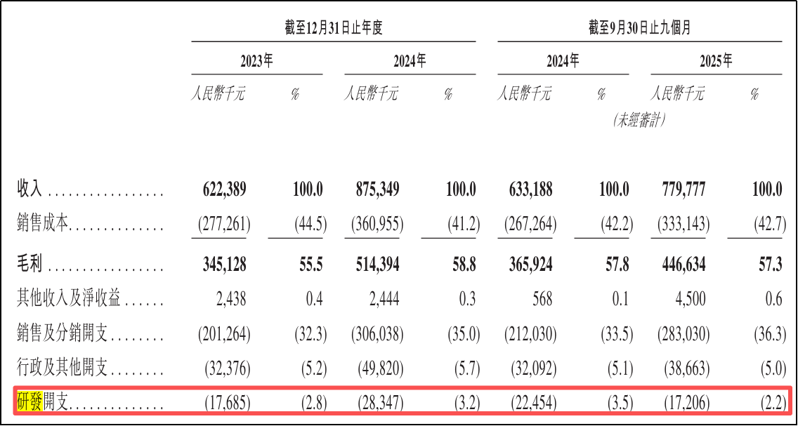 2025年,随着爷爷的农场增城工厂研发实验室的启用,外包研发活动有所减少,研发开支占总收入的比例由截至2024年9月30日止九个月的3.5%下降至截至2025年9月30日止九个月的2.2%。