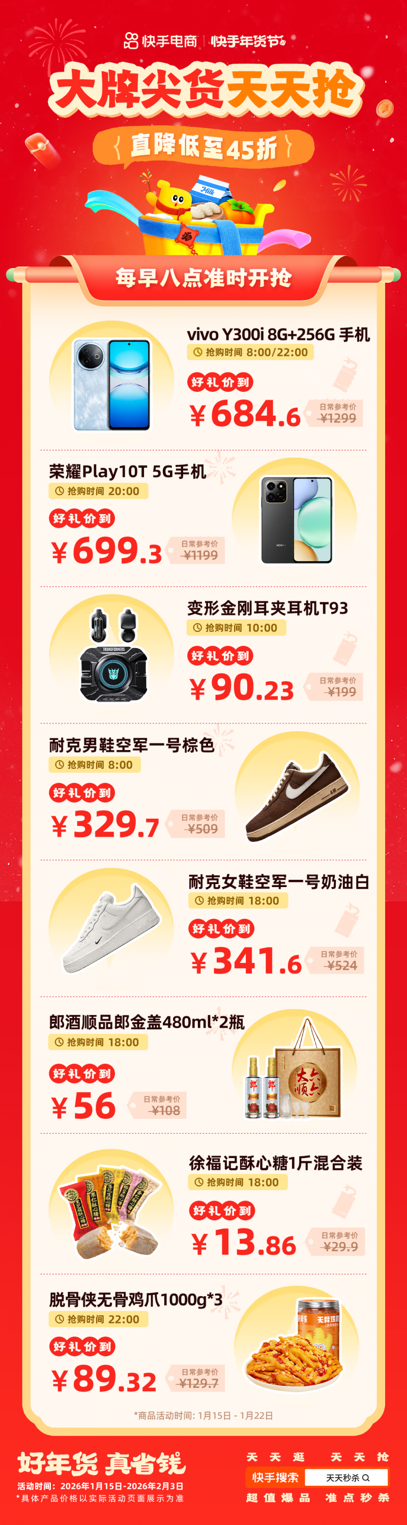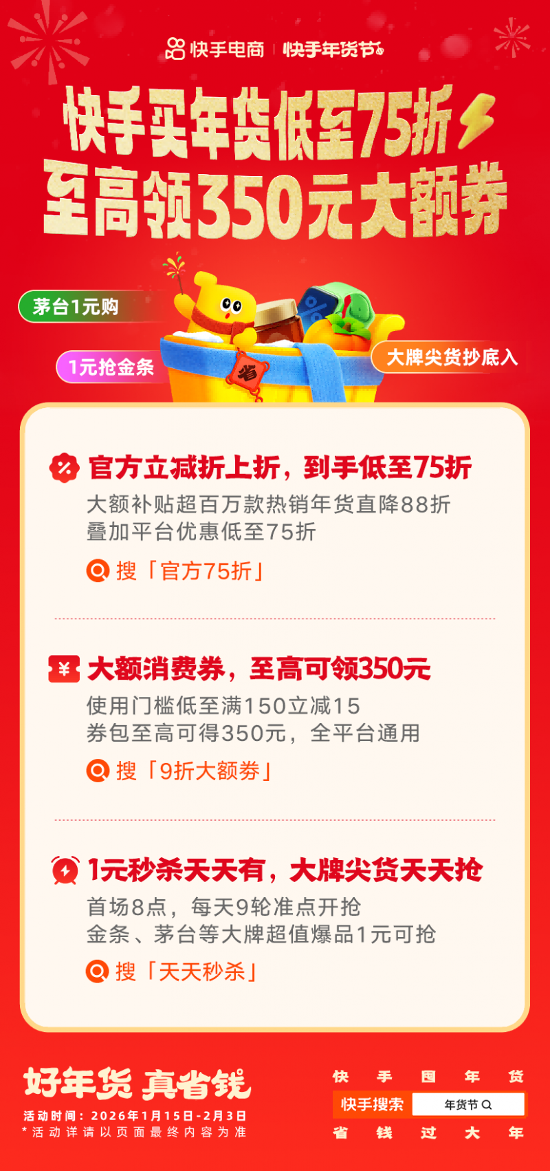 1月15日至2月3日,上快手搜索 “年货节” ,即可进入主会场,一站式购齐所有年货需求,把年味和实惠一起带回家!