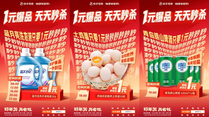 年货节期间,快手商城特别推出“1元秒杀”和“品牌尖货秒杀”两种特色玩法。平台每日开设秒杀专场,搜索“天天秒杀”即可参与,每天0点、8点、10点、12点、14点、16点、18点、20点、22点9轮准点开抢。
