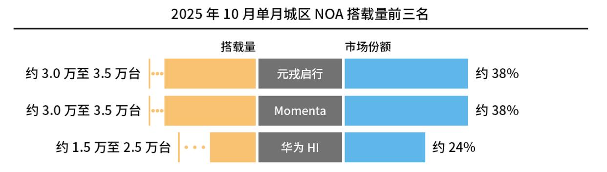 在这一过程中,以“华元魔”(华为、元戎启行、Momenta)为代表的头部供应商逐渐成为行业竞争的主导力量。尤其是在城区NOA场景的技术与市场竞争中,头部供应商的市场表现揭示了技术创新、商业化进程以及市场需求之间的紧密关系。根据2025年1至10月的数据,元戎启行在市场中表现出了强劲的增长势头,尤其是在主流价位车型的快速渗透上展现了巨大的潜力。