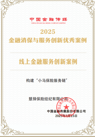 慧择“科技+服务”的深度融合模式,也获得行业权威机构的高度肯定。2025年3月,中国金融传媒发布《2025金融消保与服务创新优秀案例名单》,慧择“小马保险服务链”项目从200家金融机构报送的400余个参选案例中突围,成功入选该榜单,这是行业对其在服务创新、客户权益维护领域实践的官方认可,同期,小马保险服务还斩获2025年度 InsurStar创新媒体奖;同年6月,慧择“小马理赔”服务品牌,被评选为“年度保险中介值得信赖品牌”,今日保评审委员会评价其 “以专业能力+AI工具破解保单流转、理赔纠纷痛点,为行业树立了安心服务的新标杆”。