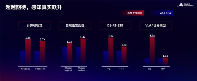 值得关注的是,彤央全系列产品的标称算力均为实测稠密算力,覆盖100T到300T范围。在计算机视觉、自然语言处理、DeepSeek 32B 大语言模型、具身智能VLA模型及世界模型等多个场景的实测中,彤央TY1000的性能全面优于英伟达AGX Orin。天数智芯副总裁郭为表示,彤央系列产品的目标是做到边端大算力国内第一,为物理 AI 连接物理世界提供最优载体,推动生成AI向“会做事”的物理 AI 转型。
