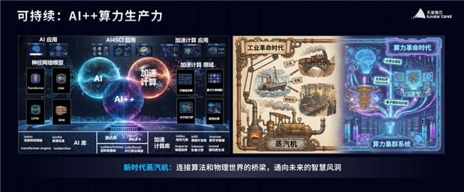 天数智芯打造的AI++算力系统新范式,统一芯片内与芯片外构建算力系统,建立软件驱动算力系统的全新模式,以底层库为基石,以模型与计算中间层为支柱,用软件的智慧,释放硬件的潜能,支撑上层不断繁荣的应用生态。