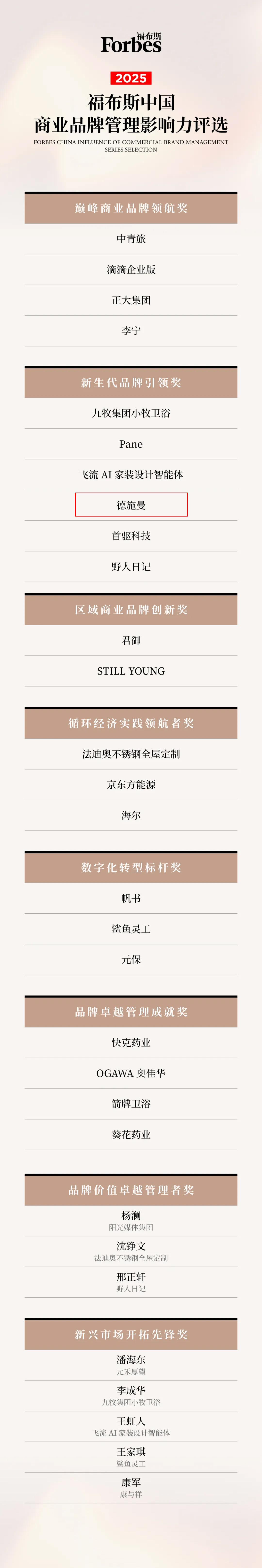 (原标题:德施曼荣膺福布斯中国「新生代品牌引领奖」)