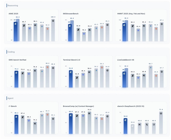 在针对智能体能力的 τ2-Bench、、BrowseComp 等测试,以及 LiveCodeBench V6 代码挑战和 AIME 2025 数学竞赛中,Step 3.5 Flash 均取得了亮眼成绩,且在 Agent 和数学任务上极具竞争力。这意味着当其面对需要结构化输出的多步推理、复杂逻辑求解、后端自动化和长时间运行等任务时,已具备支持企业级应用落地能力,尤其适用于高频工具调用和对行为可预测性有强要求的系统环境。