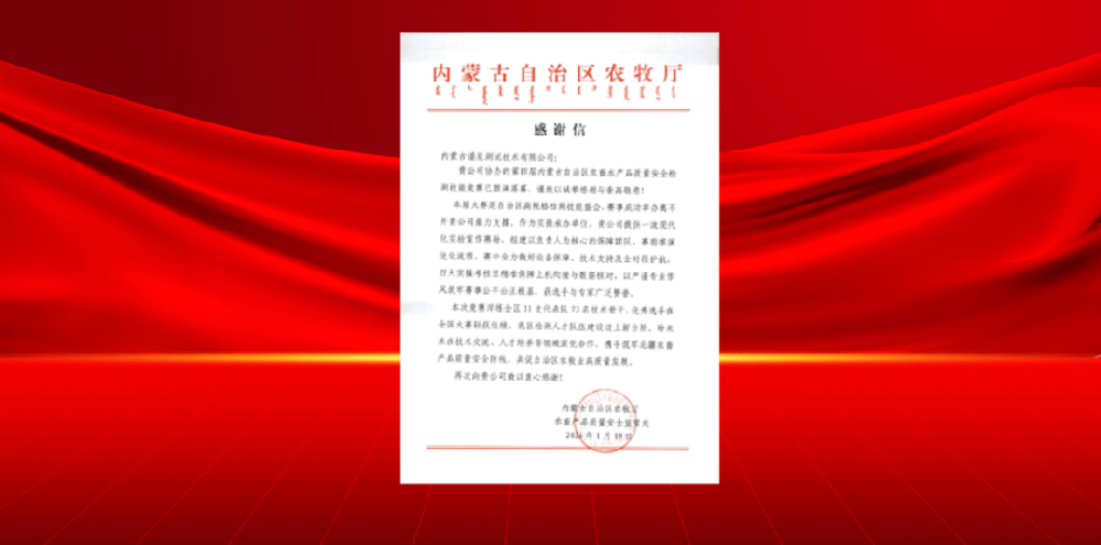 感谢信中,内蒙古自治区农牧厅对谱尼测试内蒙古公司的全产业链一站式综合服务能力给予了充分肯定。此次协办工作,不仅凸显了谱尼测试内蒙古公司在检验检测领域的专业实力,也充分展示了其承接大型活动、提供一站式综合服务的优秀能力。