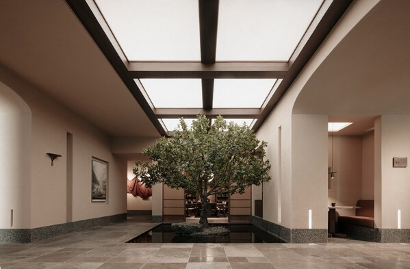 在【亚朵见野】中,来自云南的土布、土墙、藤编,以及傈僳族象形?字为灵感的视觉标志,甚至还复刻出高黎贡山百年茶树……这些在地文化的现代编译,让客户能直接代入到来自云南亚朵山村的自然闲寂。