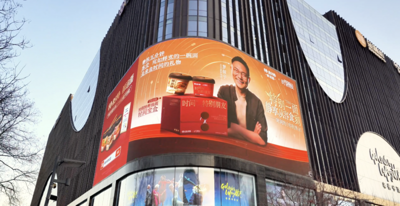 首先是物理空间的占位。康师傅在北京西单等核心地标投放大屏,罗振宇与产品并肩出现,在人群最密集的地方建立了强有力的背书,也为品牌打造了一个醒目的“公共记忆点”。