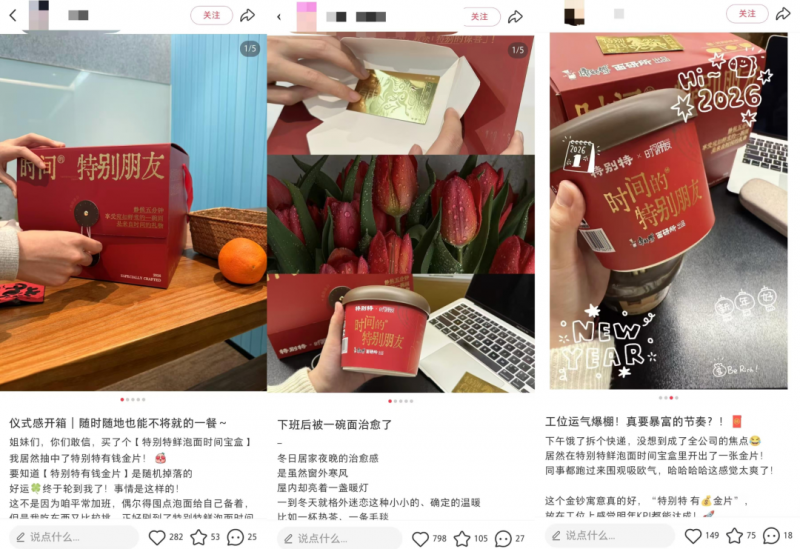 对个人来说,它是一次自我对话的仪式,是对过去一年辛勤工作的犒赏;对朋友来说,它是送出一份“深度理解”,代表我懂你的忙碌。品牌在礼盒里不仅有鲜泡面,还藏了一些很有心思的细节,比如随机掉落的定制金片。这个小小的金片就像是一个勋章,它把一顿原本匆忙的速食,变成了一次带有奖励意味的体验。它在告诉用户:即便你现在很忙,你的时间也依然珍贵,值得被体面地对待。