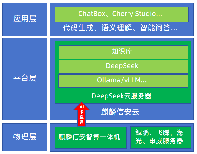 麒麟信安智算一体机支持根据不同行业用户的需求,提供灵活的软硬件定制化解决方案,赋能客户多种AI应用场景落地。同时,智算一体机享有麒麟信安原厂技术服务支持,实现软硬件配置全包揽,运维问题不犯难,有力保障DeepSeek运行更加稳定高效。