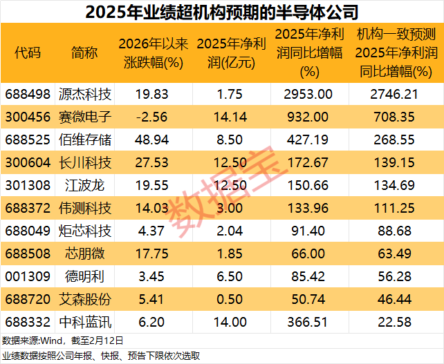 从市场表现来看,截至2月12日,半导体行业公司2026年以来平均涨幅超过18%,30余家公司2026年以来累计涨幅超过5%,普冉股份、炬光科技、欧莱新材3家公司2026年以来累计涨幅超过100%。