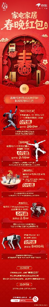 在备受关注的机器人品类中,多款春晚同款重磅来袭。宇树机器人作为连续三年登上春晚的“科技常客”,今年将再度携Unitree G1 EDU U2进阶版人形机器人登场,京东将送出30台1年免费使用权资格;松延动力的小布米机器人新春特别版,作为全球首款消费级高性能人形机器人,已接入京东JoyInside大模型,拥有超拟人的对话能力与情感识别能力,京东将通过0元抽奖送出30台;魔法原子MagicDog Pro四足机器人、越疆Rover X1机器狗,均具备强大的感知能力,是新春居家、出游的智能好伙伴,京东家电家居“春晚红包”活动将各送出80台。