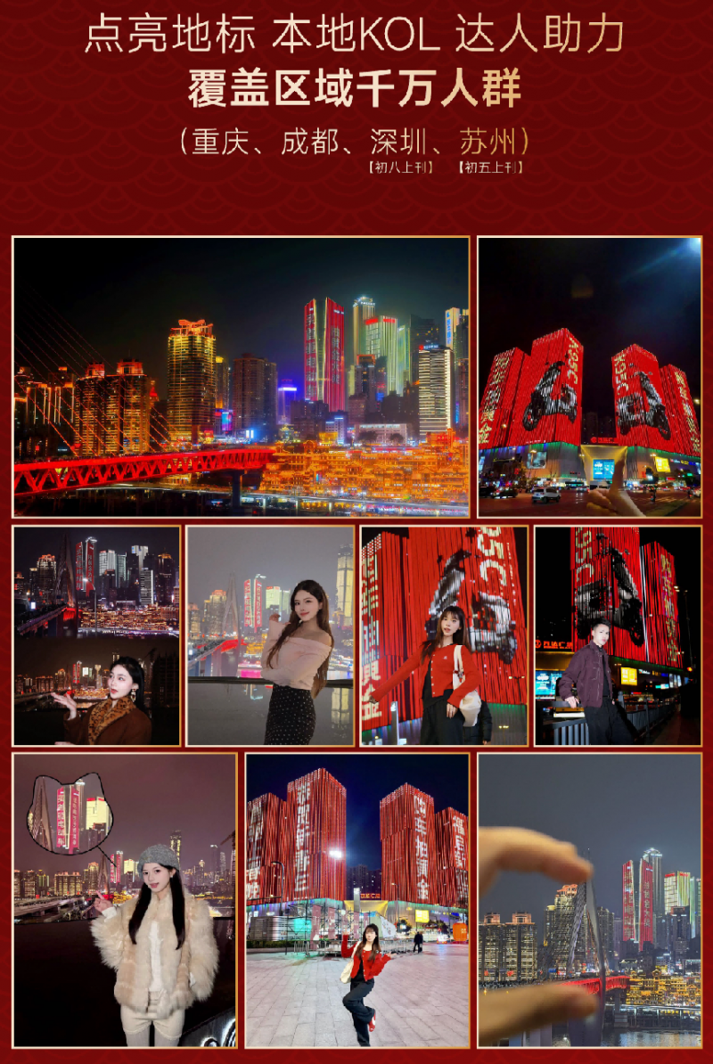 初二至初五,首驱以“霸屏春晚又霸屏全国”的强势姿态,相继点亮苏州、深圳、成都、重庆四大城市地标。当“首驱红”与城市天际线交相辉映,当“首驱上春晚”和用户寄语的光影叙事融入春节城市风景,首驱将品牌温度转化为可感知的节日仪式感。