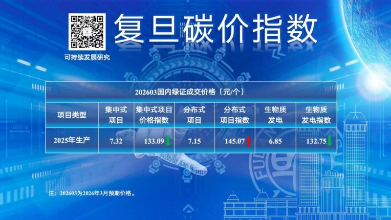 2月28日,复旦大学可持续发展研究中心(以下简称“研究中心”)公布了2026年3月复旦碳价指数结果。此次公布了2026年3月全国碳排放配额(简称CEA)价格指数、2026年12月全国CEA价格指数、2026年3月全国CCER价格指数以及2026年3月中国绿色电力证书GEC价格指数。