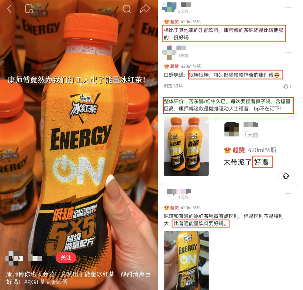 事实上,社交平台上关于康师傅冰红茶Energy的笔记已经不断涌现:有人表示新品让他“放弃了咖啡”“比其他能量饮料提神效果好,口感更好喝”,有人感慨“康师傅冰红茶Energy源自天然能量,提神更安心,再也不用担心会心悸了”……电商评论区也是好评如潮。随着康师傅冰红茶Energy的上市,其品牌势能和话题热度还在持续发酵,以“超赞”口碑触达更多圈层人群。