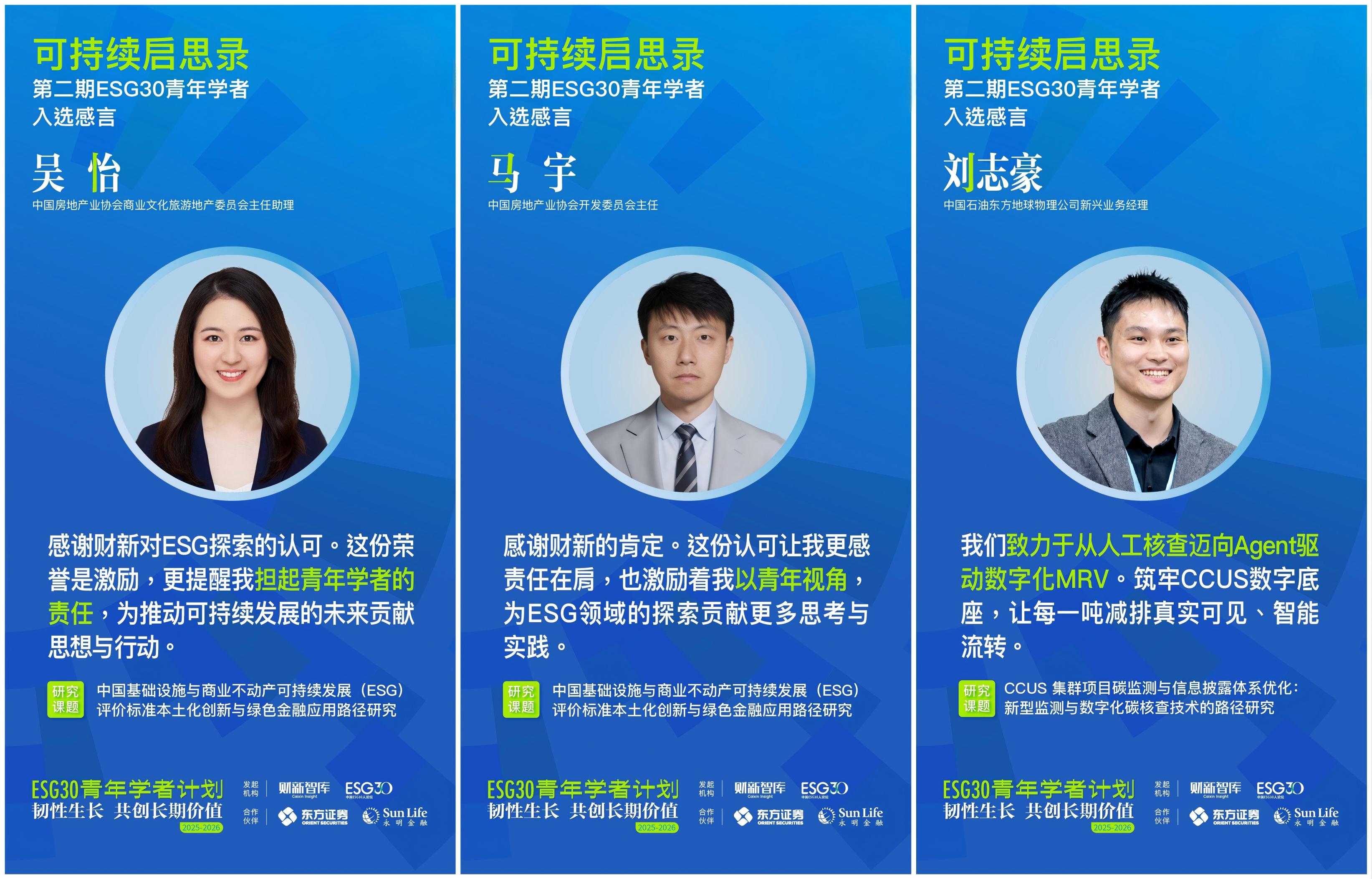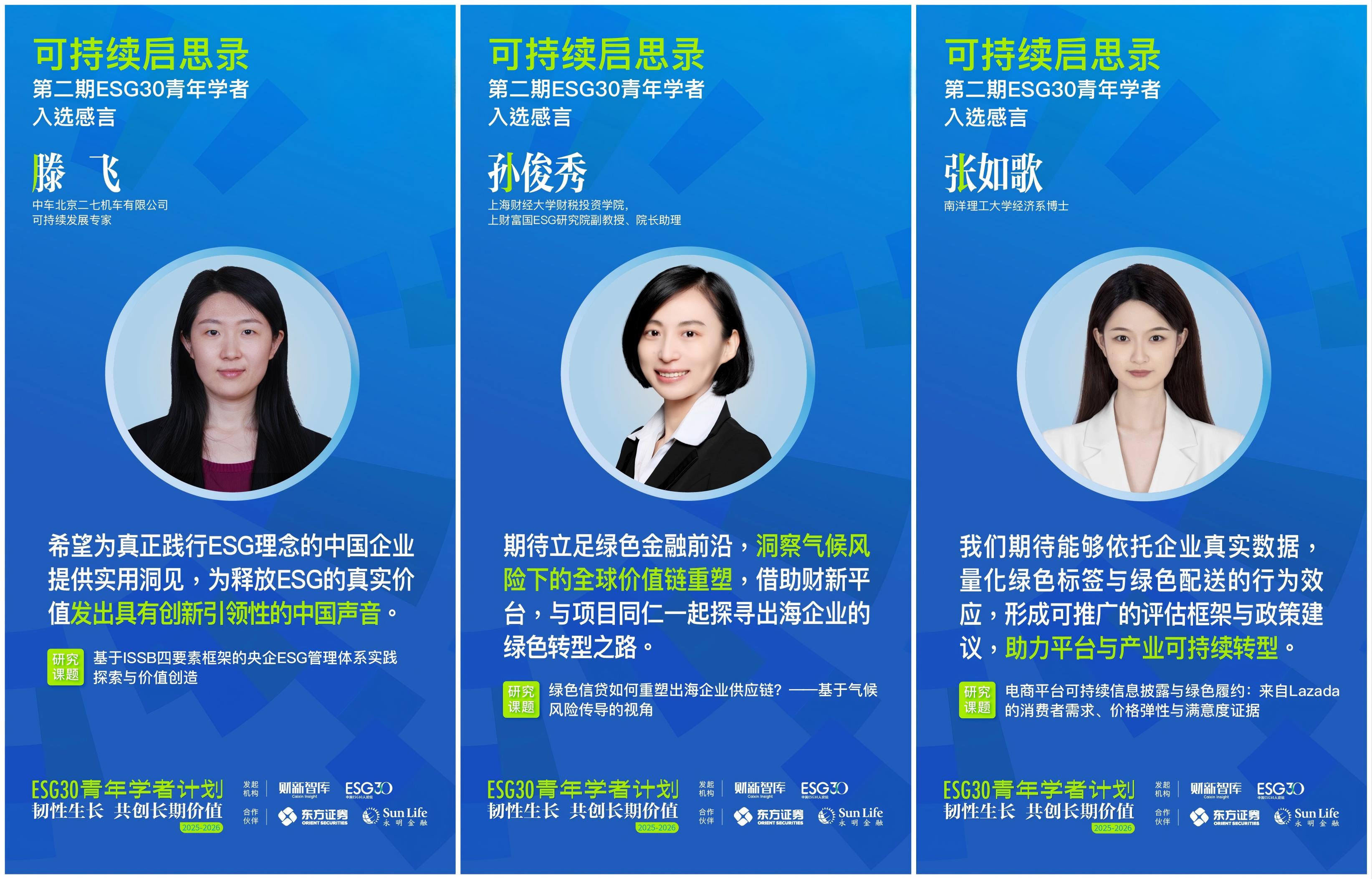 在首期成功举办的基础上,财新智库携手合作伙伴东方证券、香港永明金融,于2025年11月正式启动“ESG30青年学者计划第二期(2025-2026)”。第二期计划以“韧性生长 共创长期价值”为主题,立足国家“十五五”规划新起点,聚焦可持续科技、可持续金融、可持续商业三大方向,探索三者协同驱动长期价值实现的机制与路径,探寻“技术、资本、市场、政策”闭环解决方案,推动“国资、外资、民资”互鉴,促进ESG从理论到规模化应用、从外生到嵌入内生机制的突破。