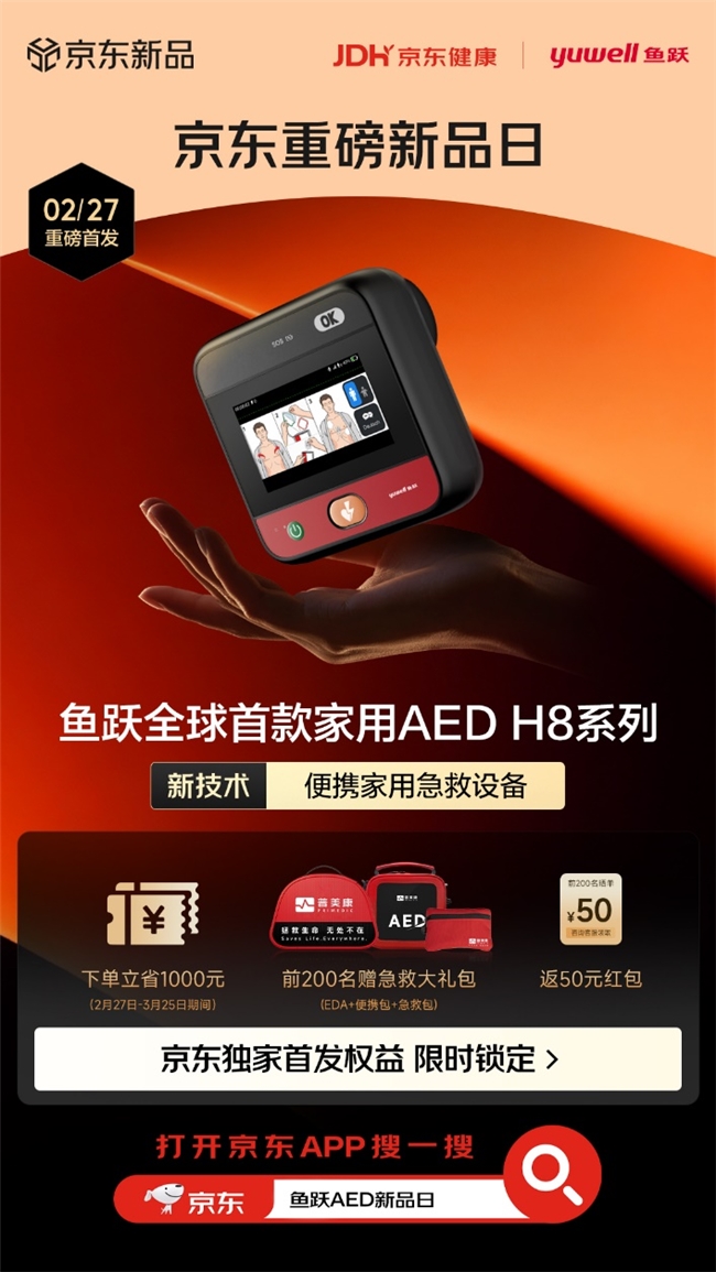 3月4日,鱼跃医疗旗下普美康全新一代Heartsave H8半自动体外除颤器(AED)多款型号在京东健康平台全网首发。该系列AED设备以“小巧便携、长效续航、智能互联”为核心卖点,为家庭、办公及户外场景提供即时救援保障。此次新品在个人消费端与企业端同步首发,标志着京东健康与鱼跃医疗战略合作的进一步深化;双方将整合全渠道资源与医疗服务生态,共同推动AED从专业医疗设备向大众化急救工具普及。即日起,用户可登录京东APP搜索“鱼跃AED新品日”直达会场,为安全增添一道“生命保险”。