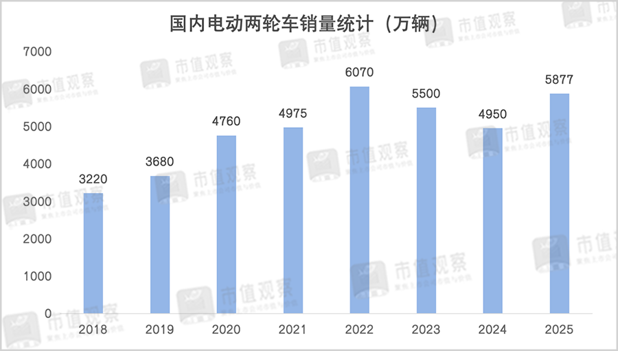 2025年,电动双轮车受到行业低库存、新国标过渡期叠加国家补贴影响销量明显上涨。据奥维云网(AVC)数据,年内国内总销量为5876.7万辆,同比增长了16.6%。