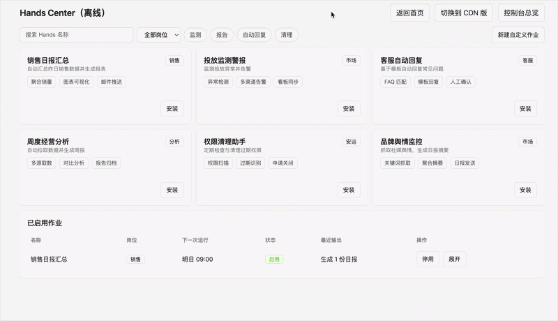 ● 岗位化Hands(数字员工):我们预置了适配销售、市场、运营、客服、分析等不同岗位的“数字员工”。企业可以像启用SaaS服务一样,直接拥有一个能干活、懂业务的AI——无需开发,开箱即用。每个Hands都支持自定义运行频率、数据源及输出渠道,可按预设节奏完成监控、整理、产出全流程,实现“人不催、事自办”。